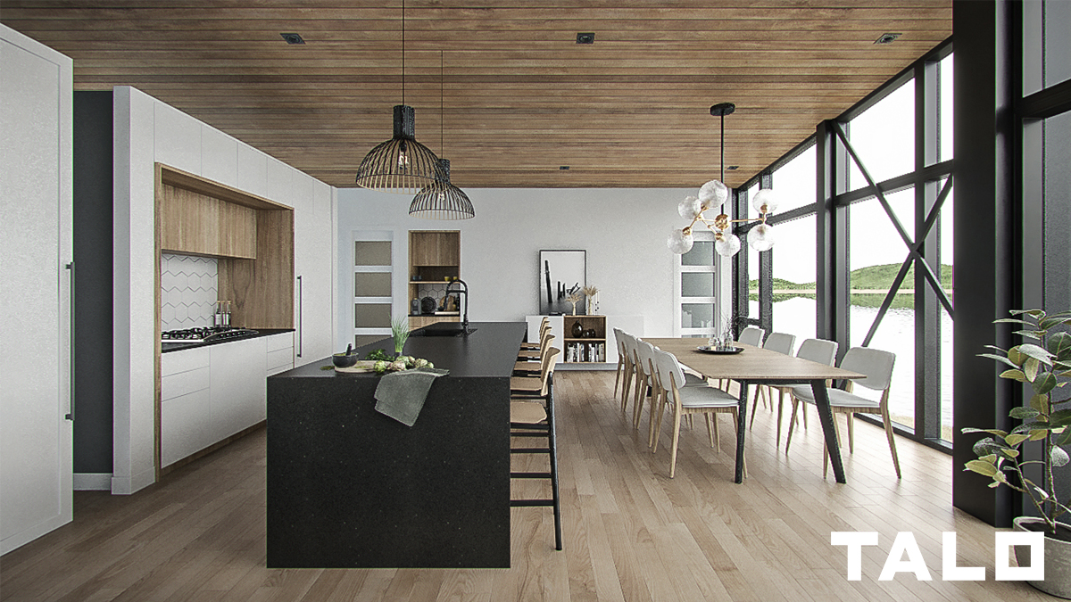 La maison HOWARD est idéale pour un terrain avec une vue panoramique sur un plan d’eau, par exemple, à l’arrière. Sa façade moderne s’intègre élégamment au site et sa terrasse couverte, dans le prolongement des aires de vie à l’étage, brouille la limite entre l’intérieur et l’extérieur.