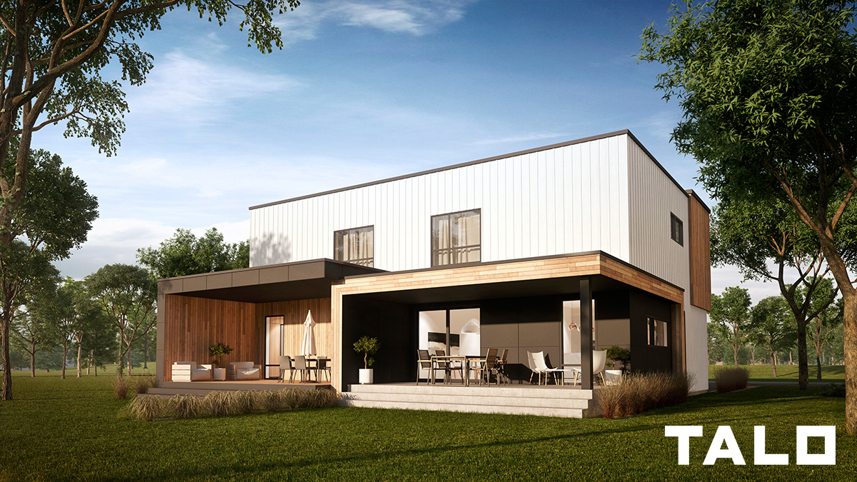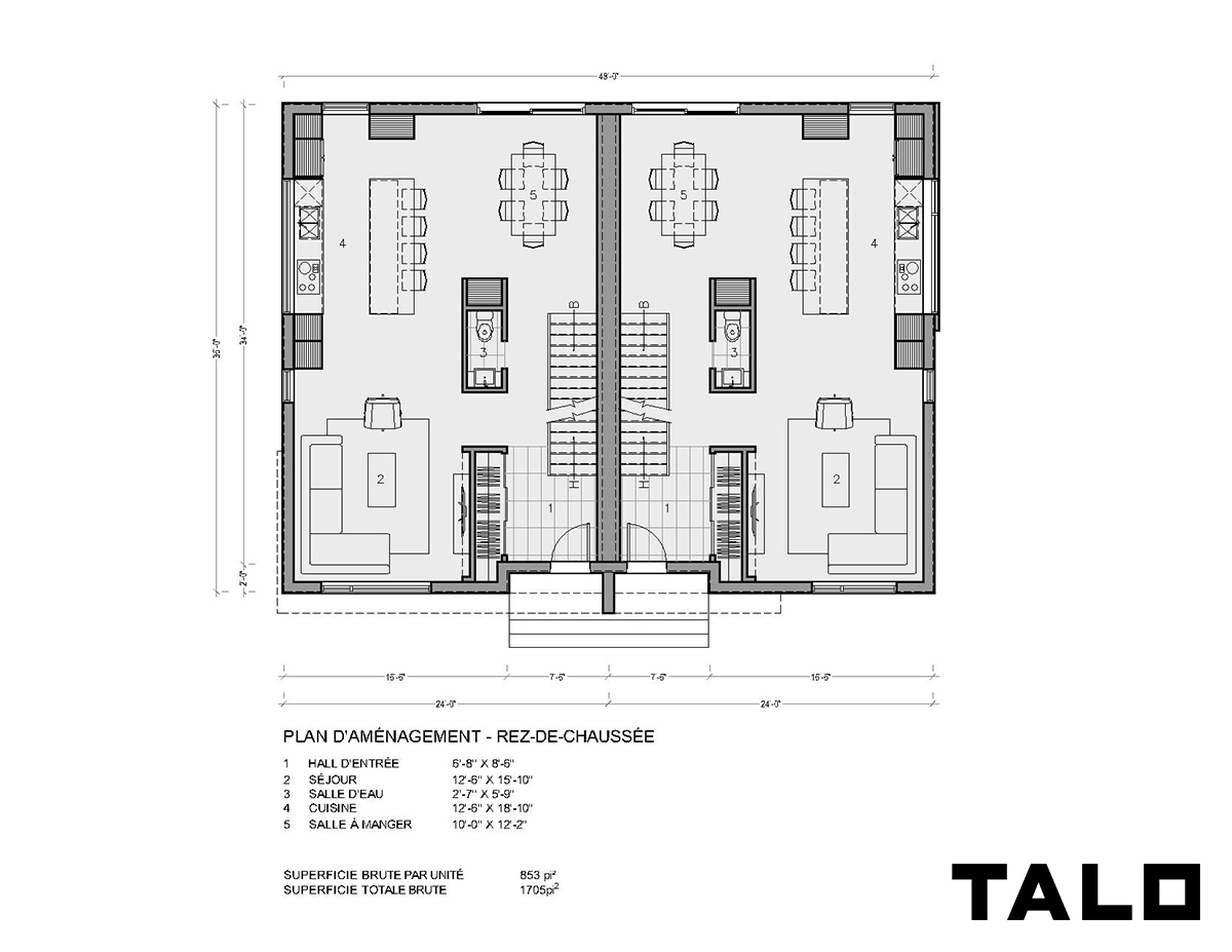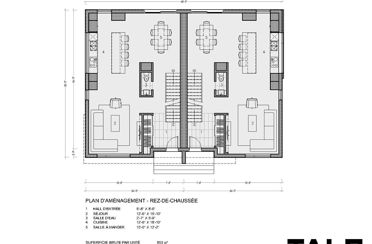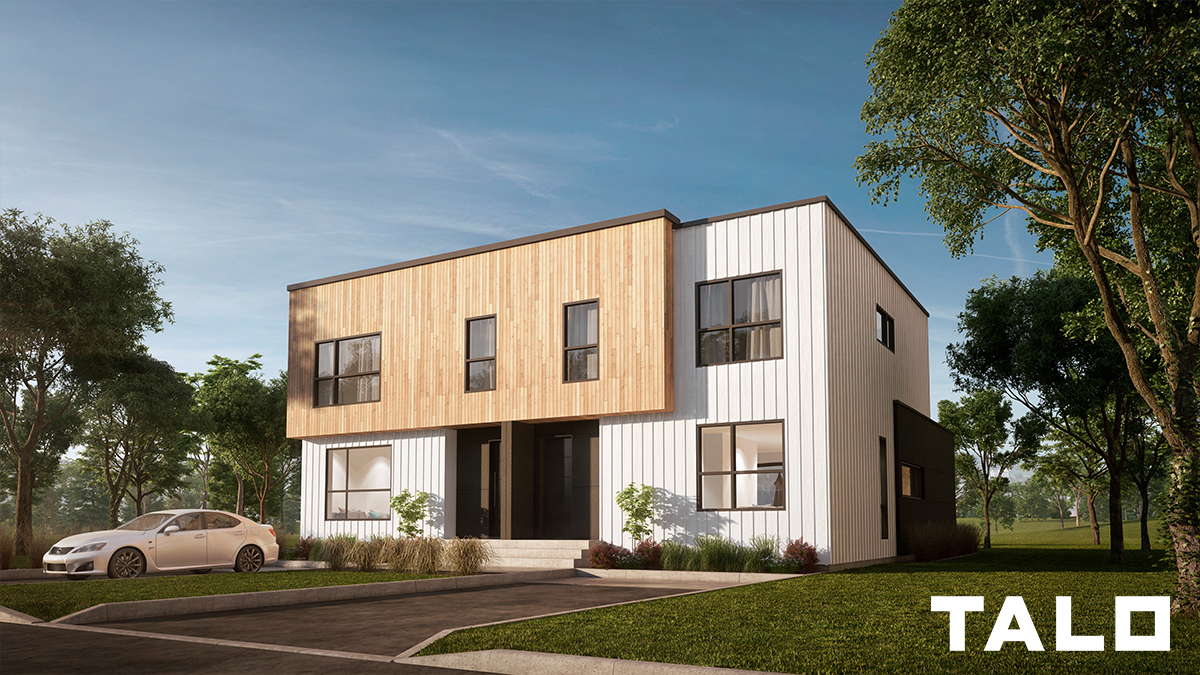 Cette maison jumelée présente une architecture simple et actuelle. La partie asymétrique parée de clin de bois brouille l’effet « miroir » habituel de ce type d’habitation.