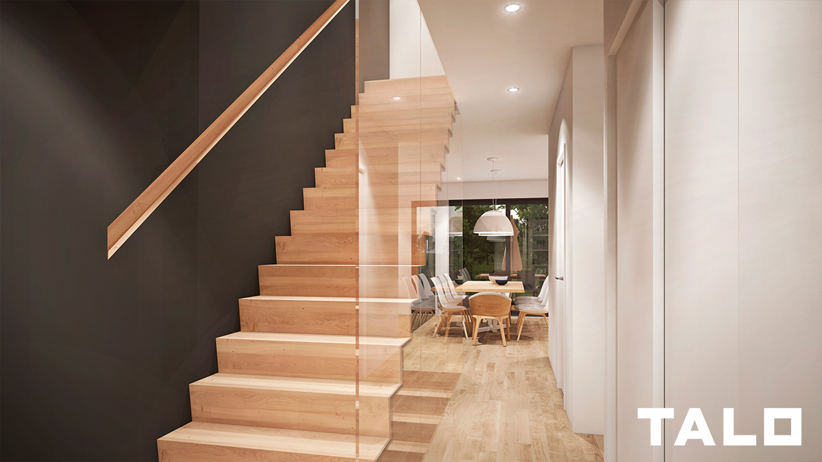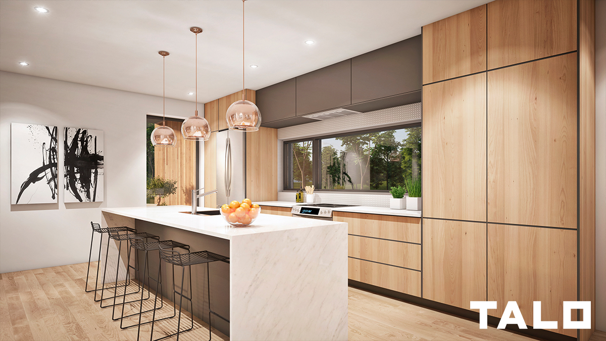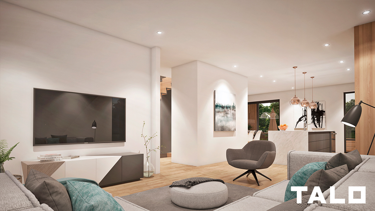 L’entrée est spacieuse et fonctionnelle. Elle est séparée des espaces de vie par le vestiaire et la salle d’eau. Les espaces du rez-de-chaussée sont décloisonnés. La cuisine, simple et linéaire, se trouve à l’arrière, avec la salle à manger, d’où l’on accède à la magnifique terrasse couverte par une porte-fenêtre coulissante.