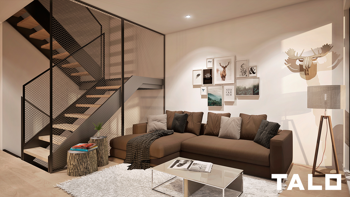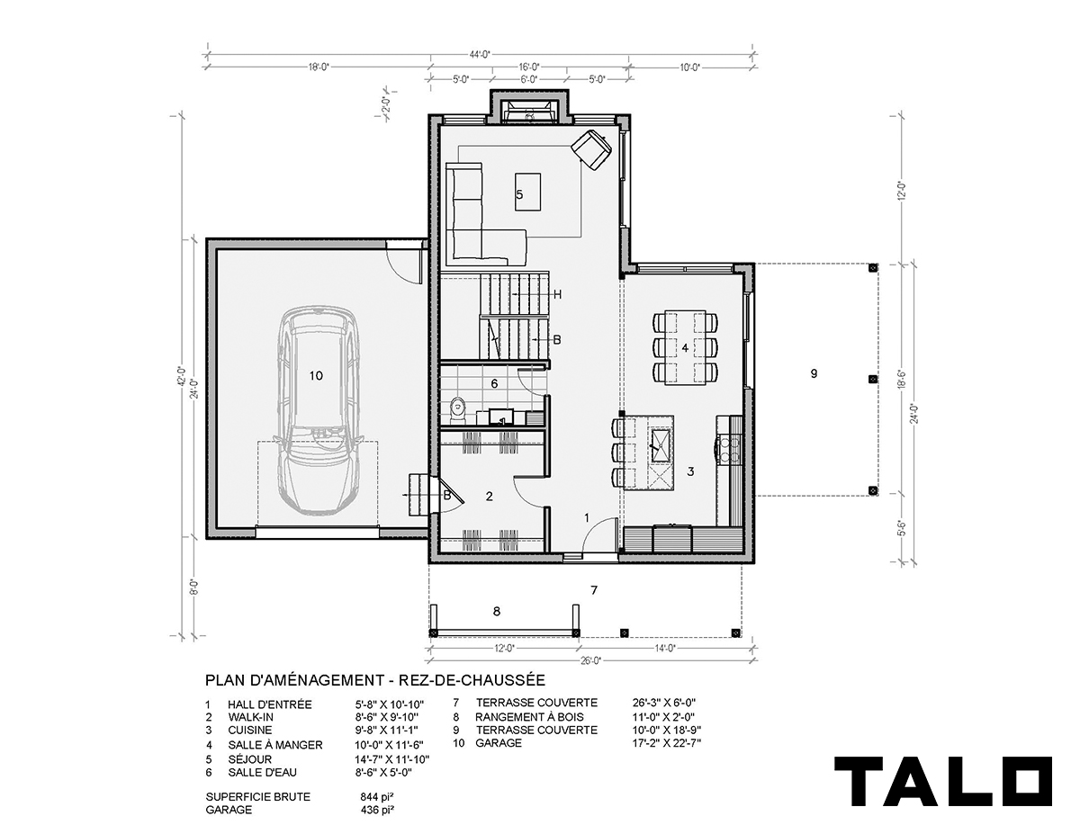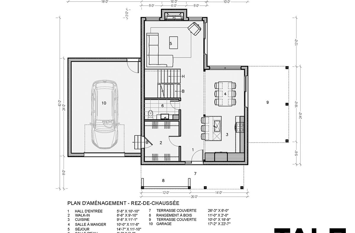 Au rez-de-chaussée, l’aménagement simple et fonctionnel sépare le séjour de la salle à manger et de la cuisine. Un grand vestibule et une salle d’eau se situent entre le garage et les espaces de vie de l’habitation.