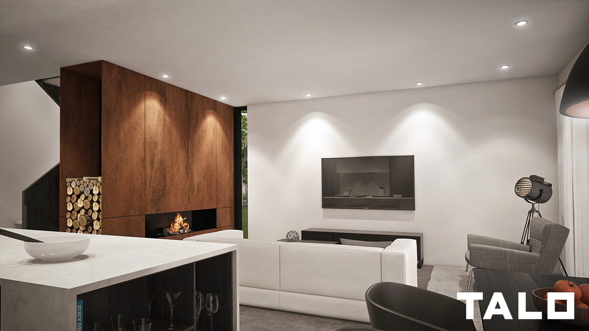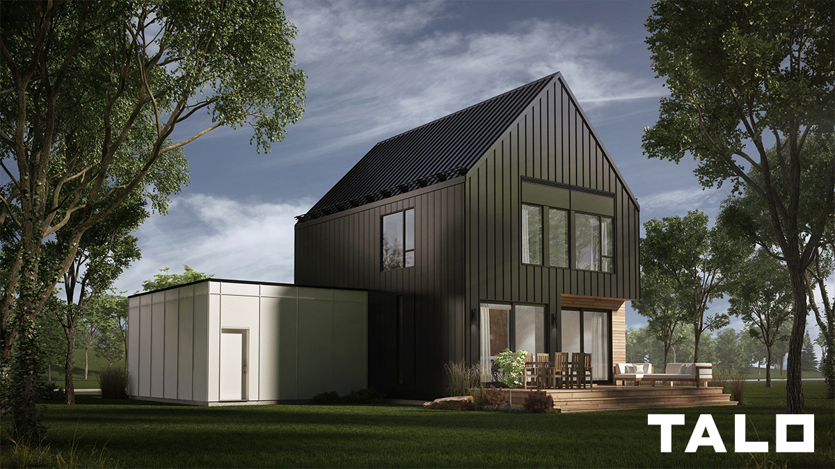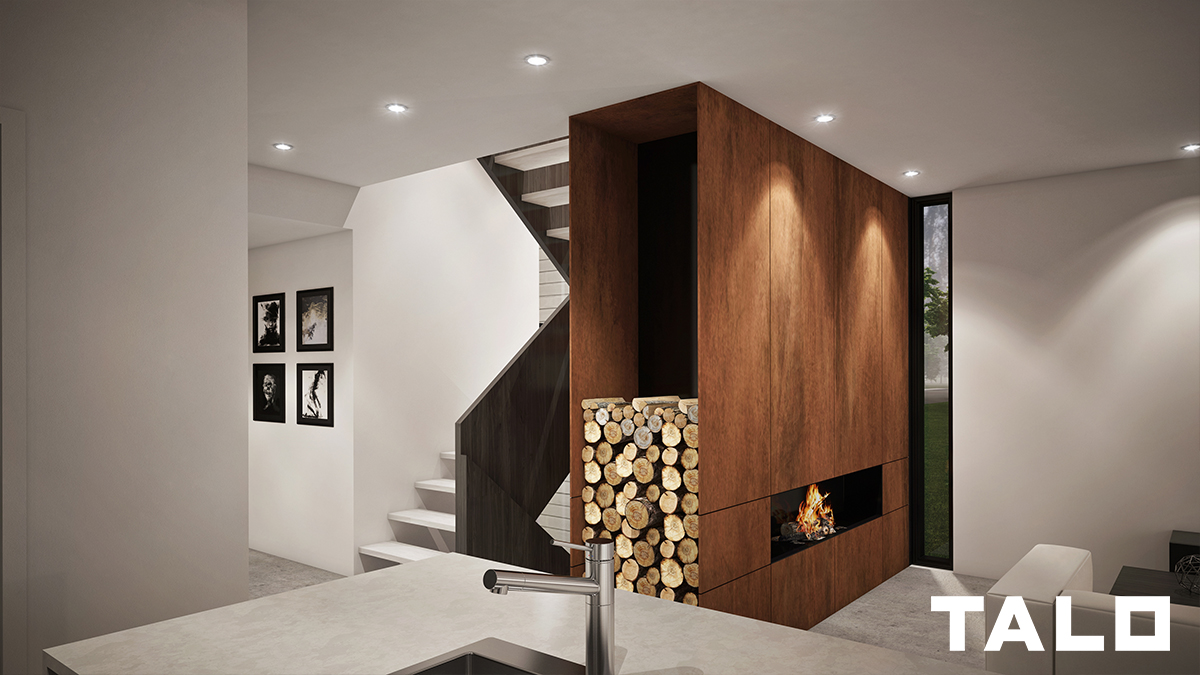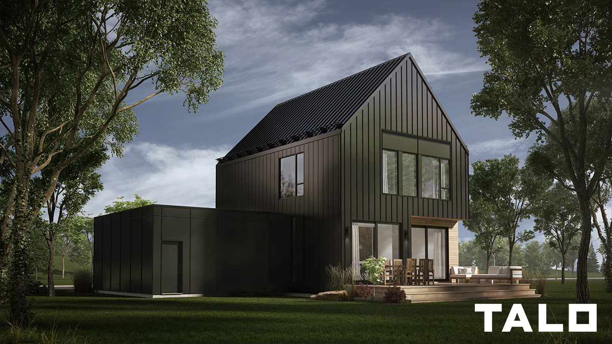 Cette maison compacte et fonctionnelle s’inspire des courants architecturaux de l’Europe du Nord. Ses formes sont simples et épurées. Une partie secondaire à toit plat s’insère dans le bâtiment principal, qui regroupe l’entrée et le garage. Sa toiture à pente prononcée et le parement d’acier sont idéaux pour un climat où la neige prédomine plusieurs mois par année.