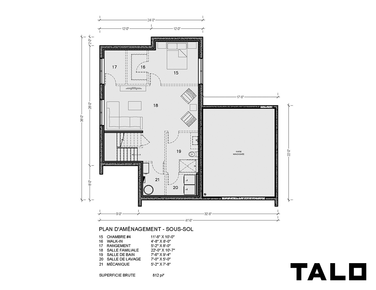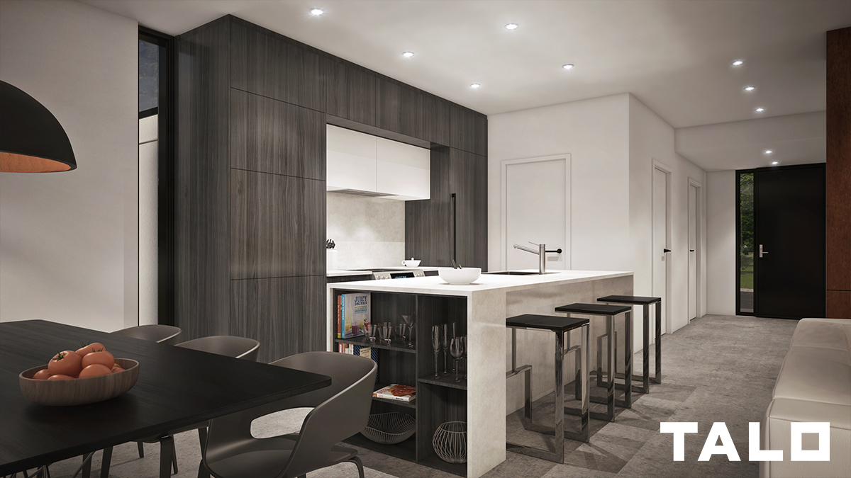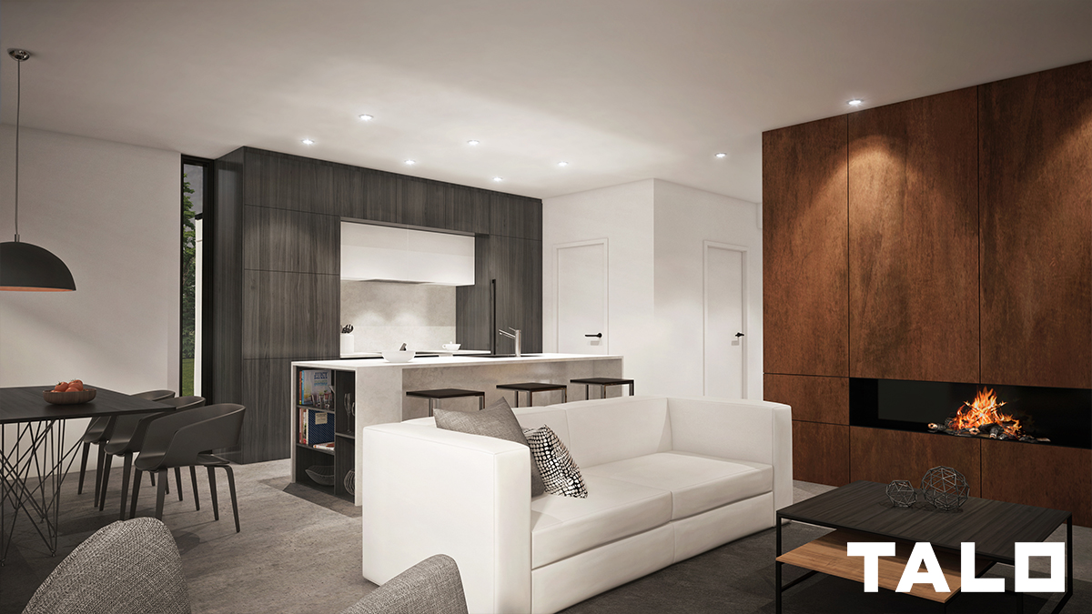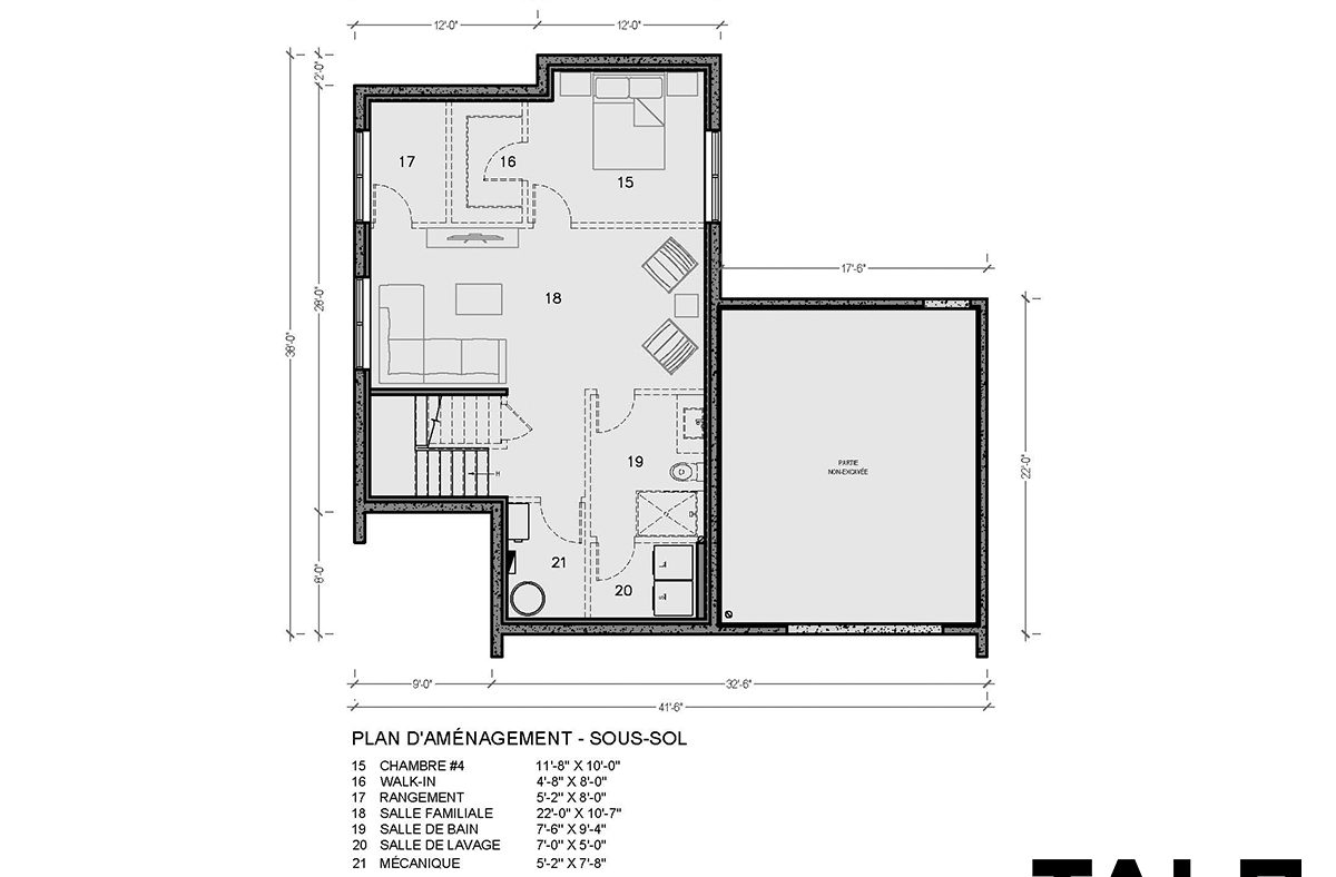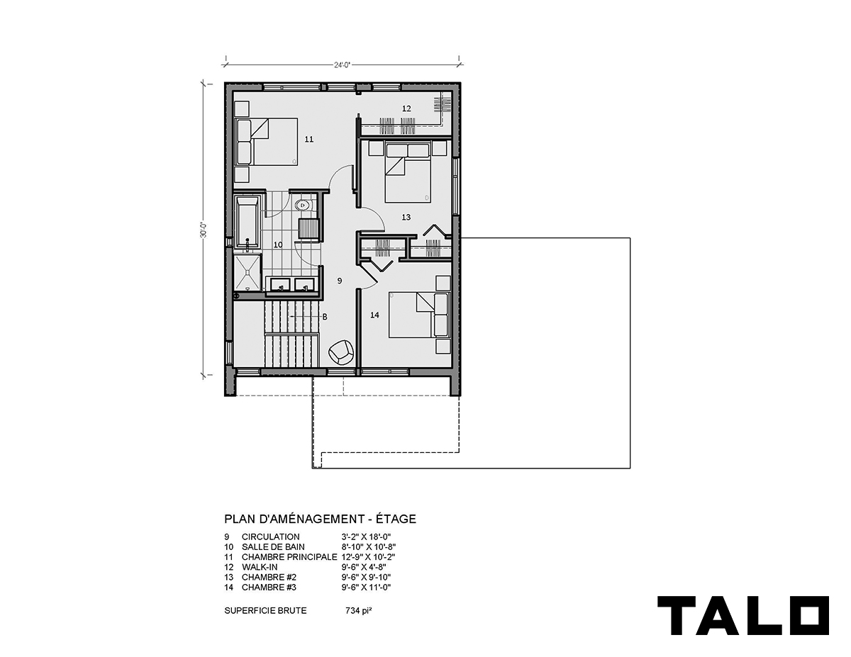 Au rez-de-chaussée, qui est à aire ouverte, se regroupent les pièces de vie, à l’arrière de la maison. L’entrée, l’escalier et les autres pièces de service sont regroupées à l’avant. À l’étage, on trouve 3 chambres confortables et la salle de bain. La chambre principale, située à l’arrière, bénéficie d’un grand vestiaire walk-in et d’un accès direct à la salle de bain.